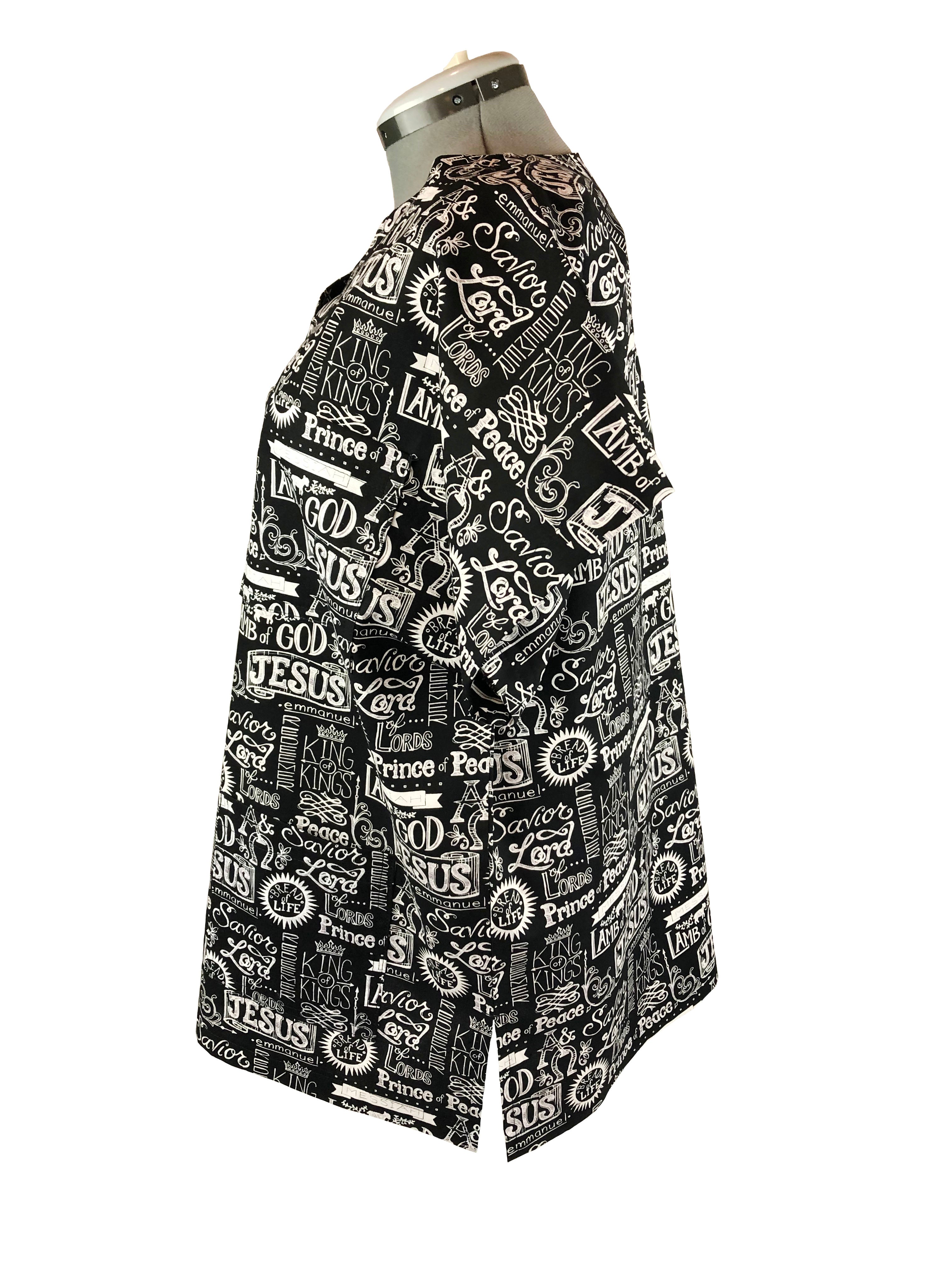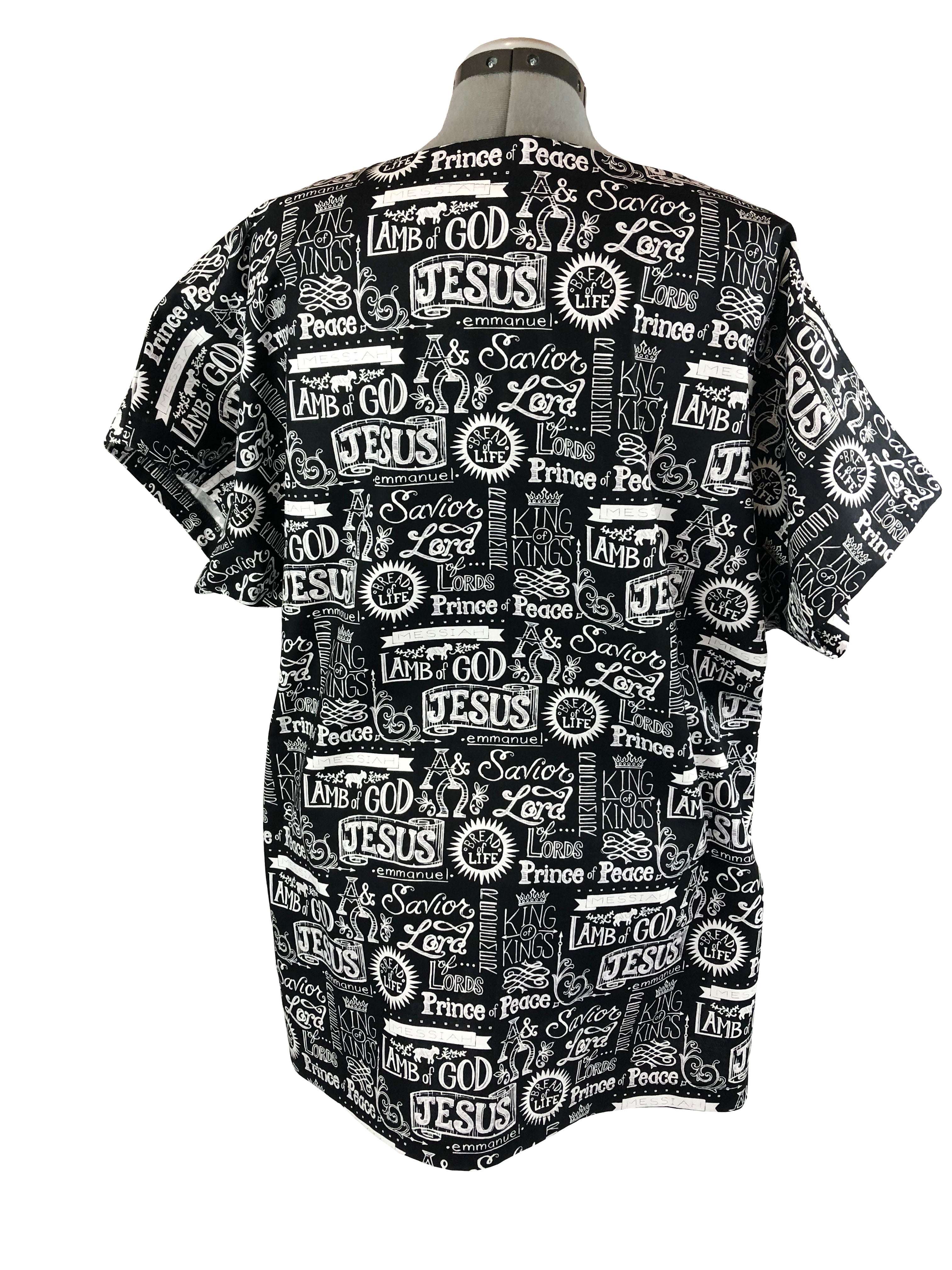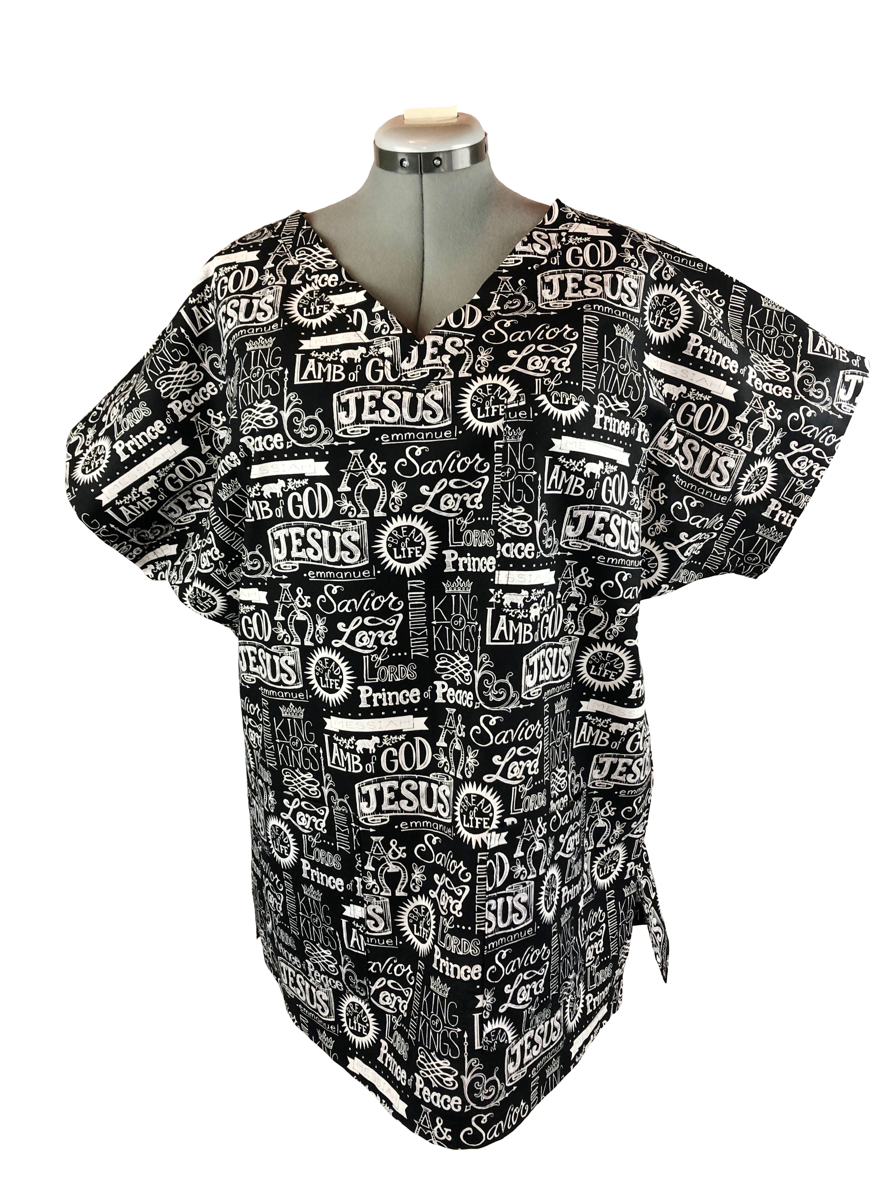 Proclaim your faith with this three-pocket Christian scrub top. This Christian scrub top has various words of affirmation and inspiration imprinted on it. This scrub top is made of 100% cotton. The scrub top has a V-neck with short sleeves. There are one small breast pocket and two larger pockets near the bottom of the scrub top. The scrub top comes in five sizes: Small, Medium, Large, X-Large, and XX-Large.
