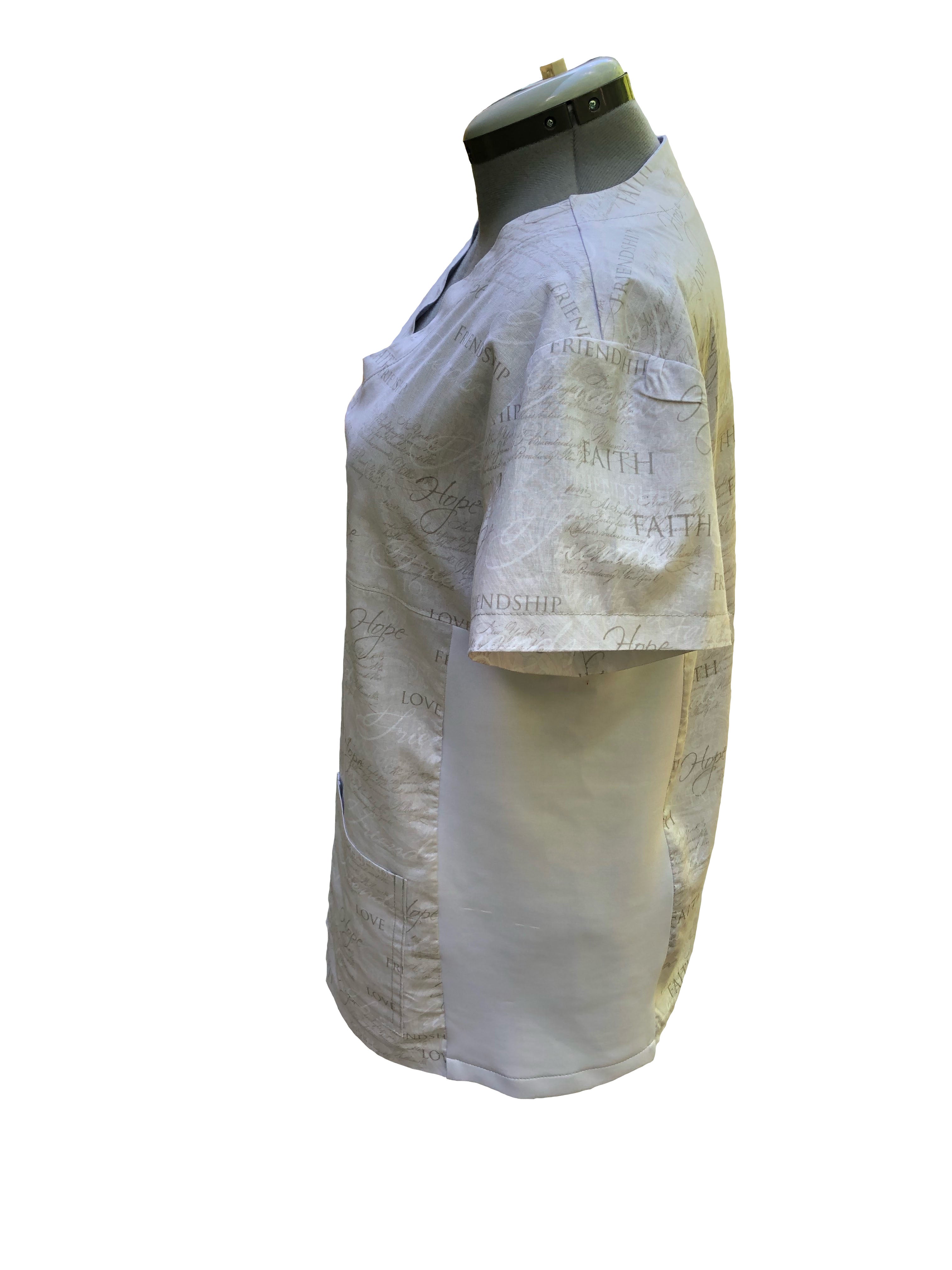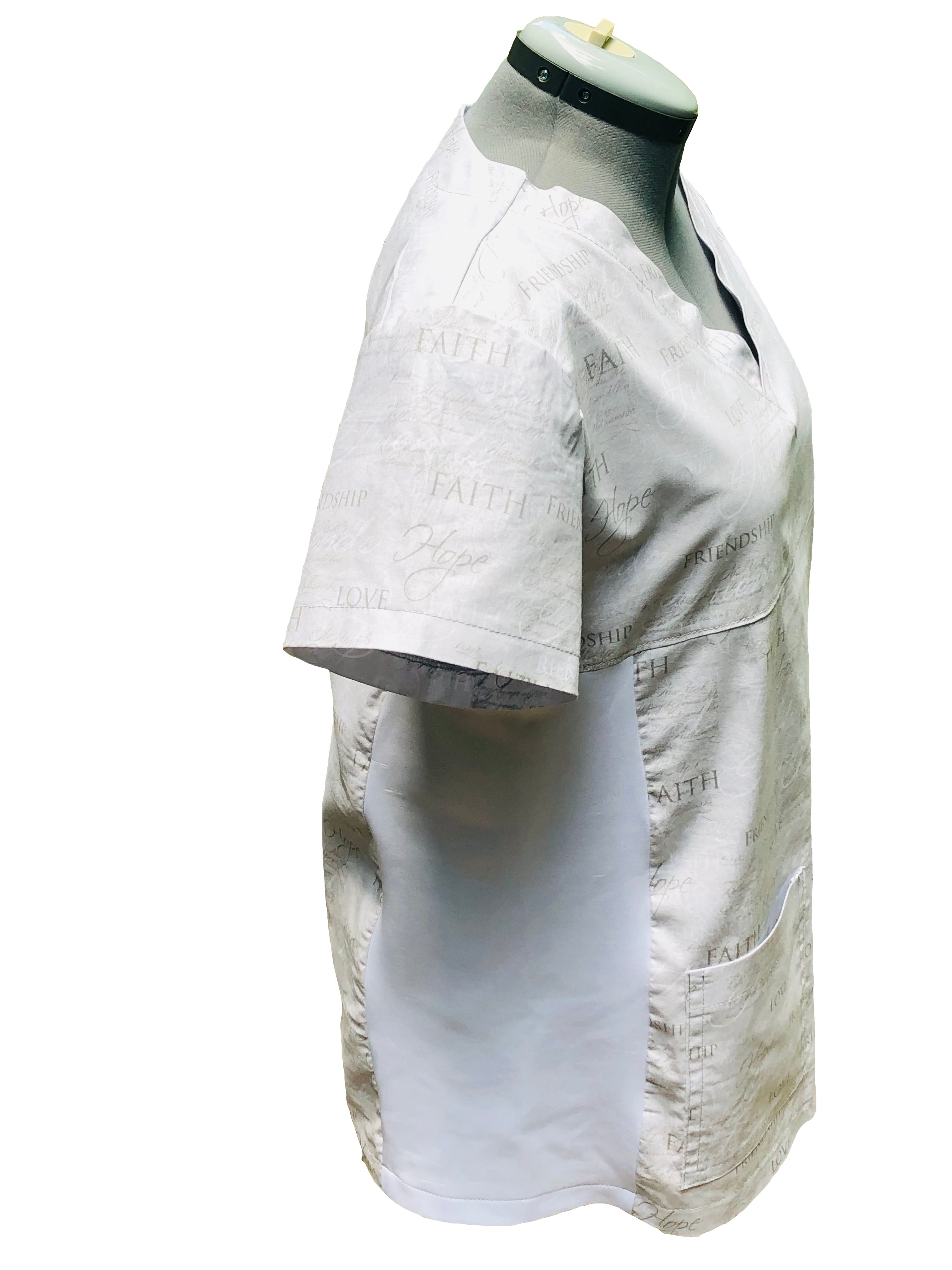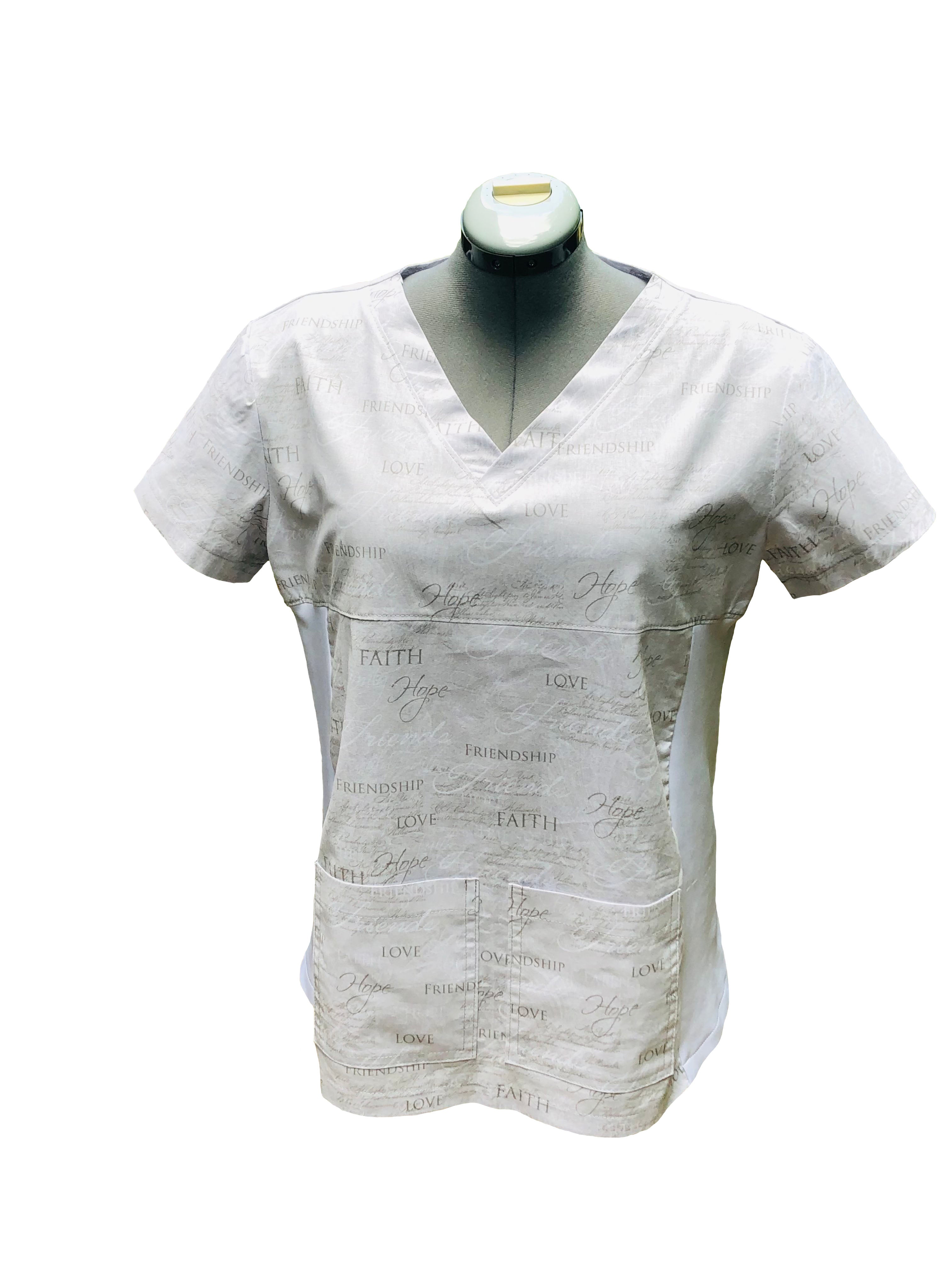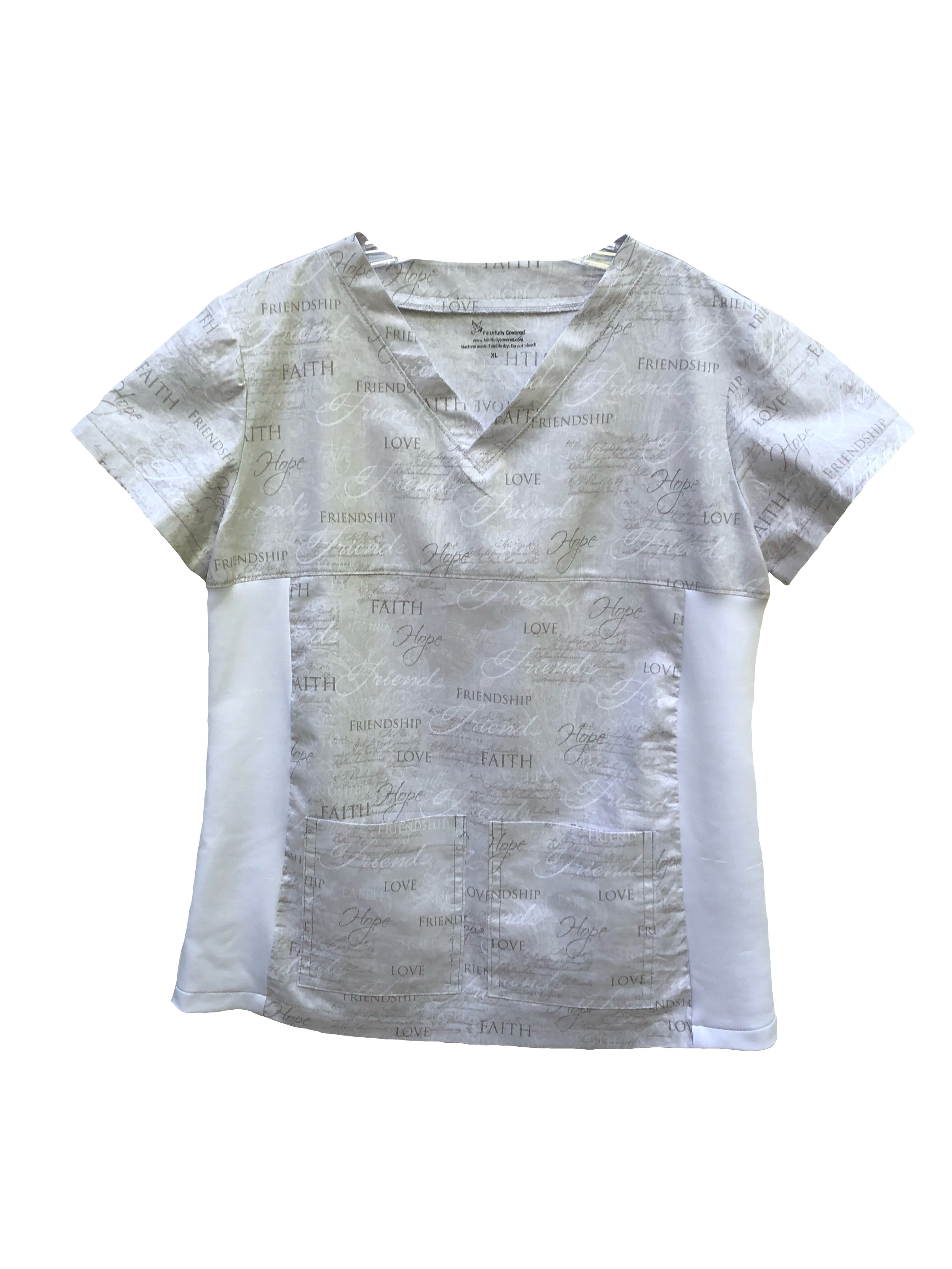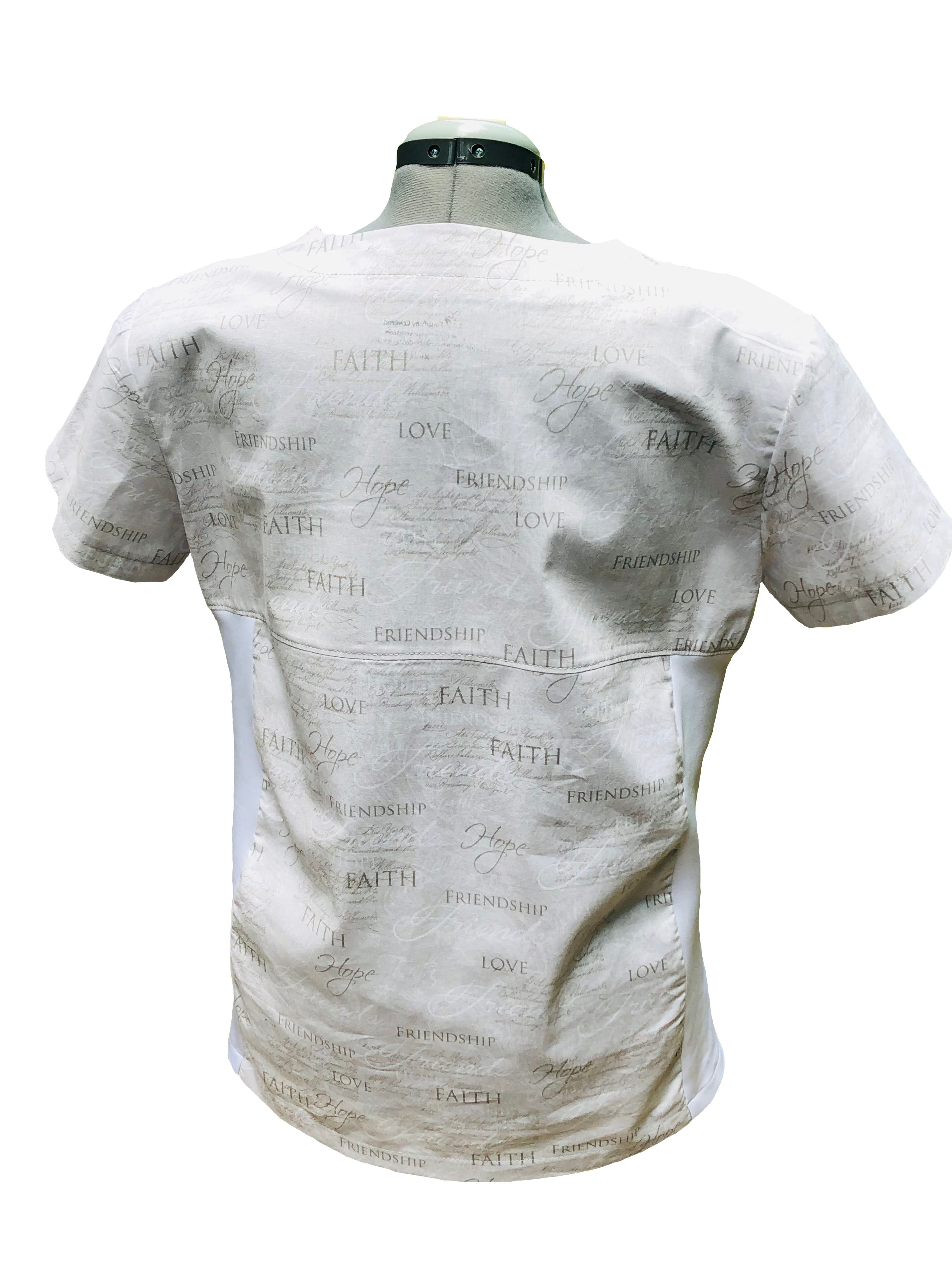 Proclaim your faith with this two-pocket Christian scrub top. These inspirational scrubs have various words of affirmation and inspiration imprinted on them. This scrub top is made of 100% cotton and has side panels that are made of stretchable knit that allows for greater movement. Also, the side panels have contrasting colors. The scrub top has a V-neck with short sleeves. The scrub top comes in five sizes: Small, Medium, Large, X-Large, and XX-Large.