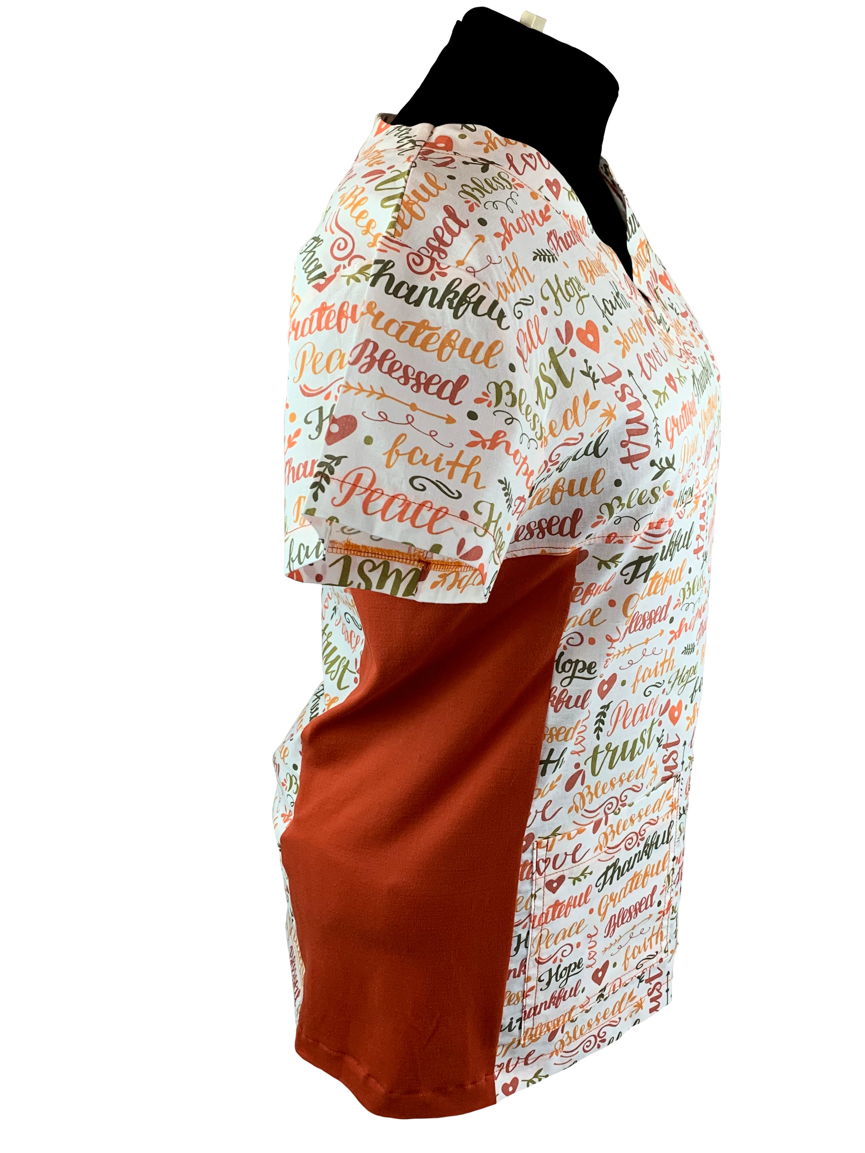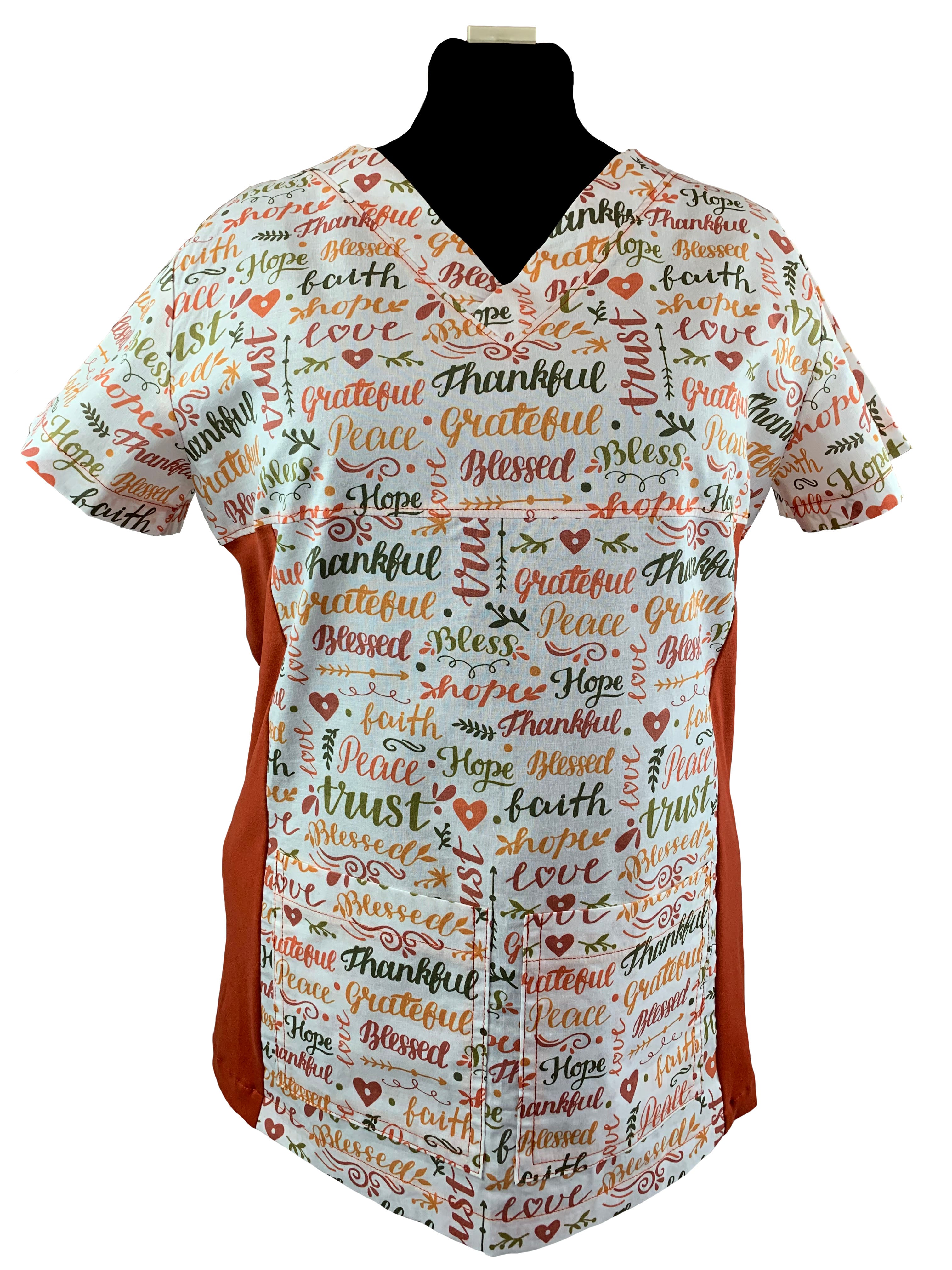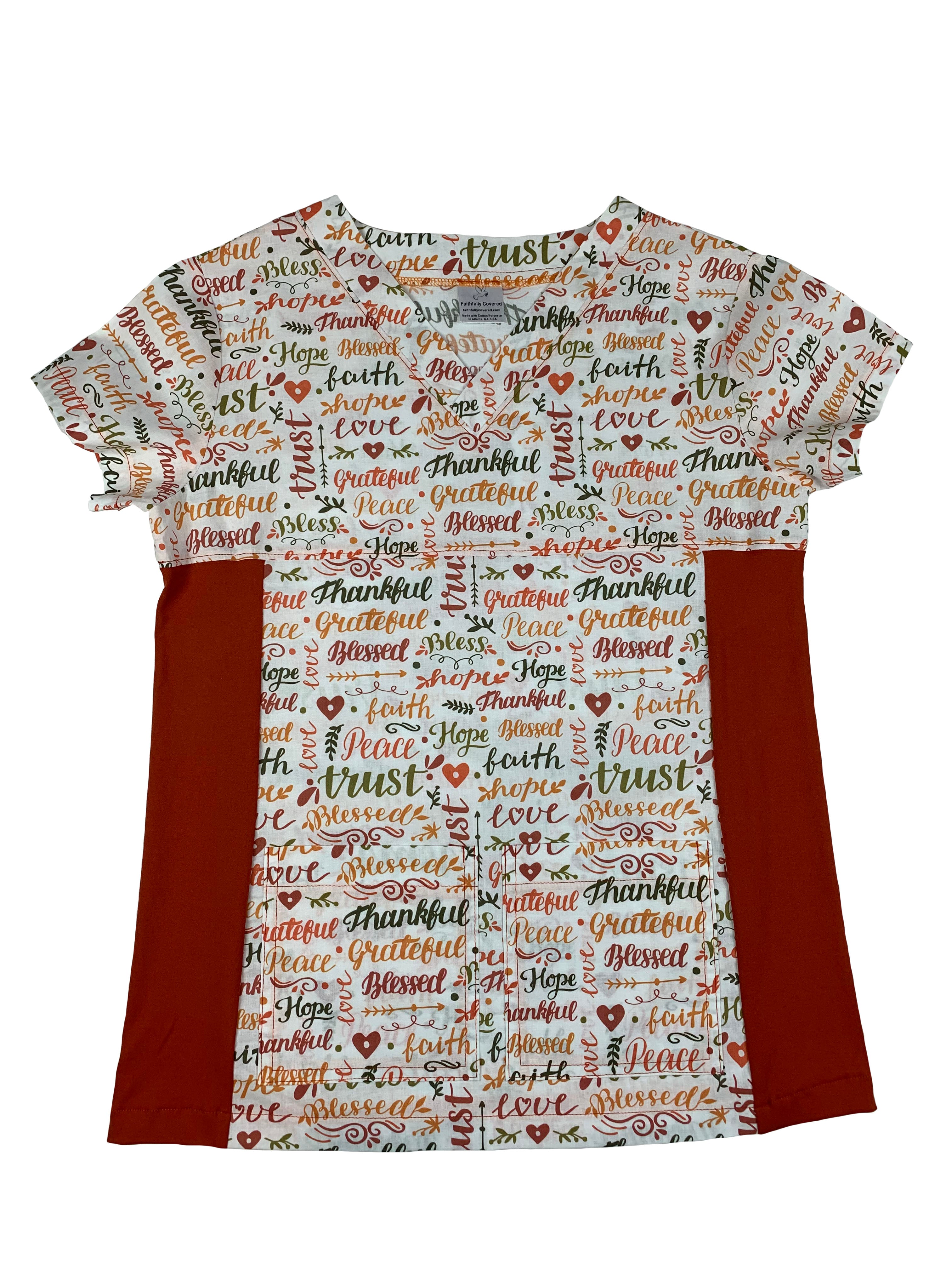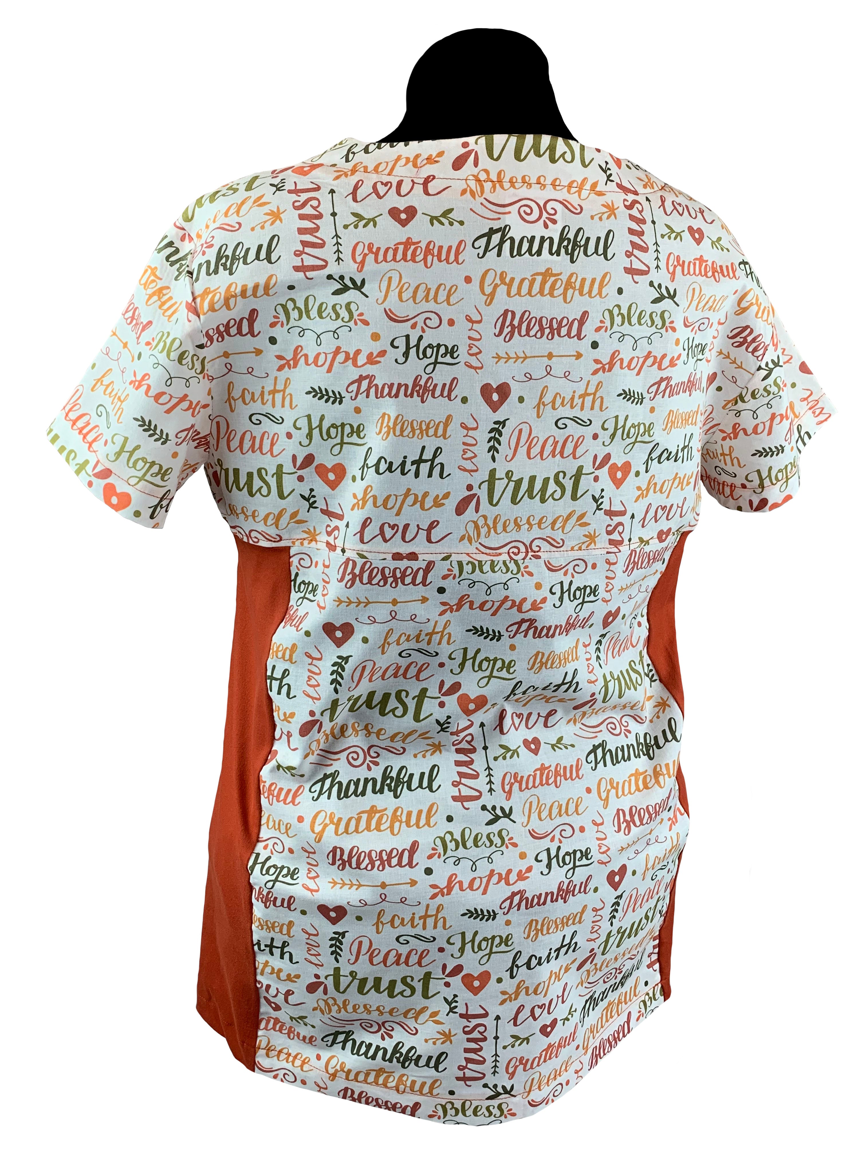 Christian Scrub Top with Inspirational Words -Thankful and Blessed