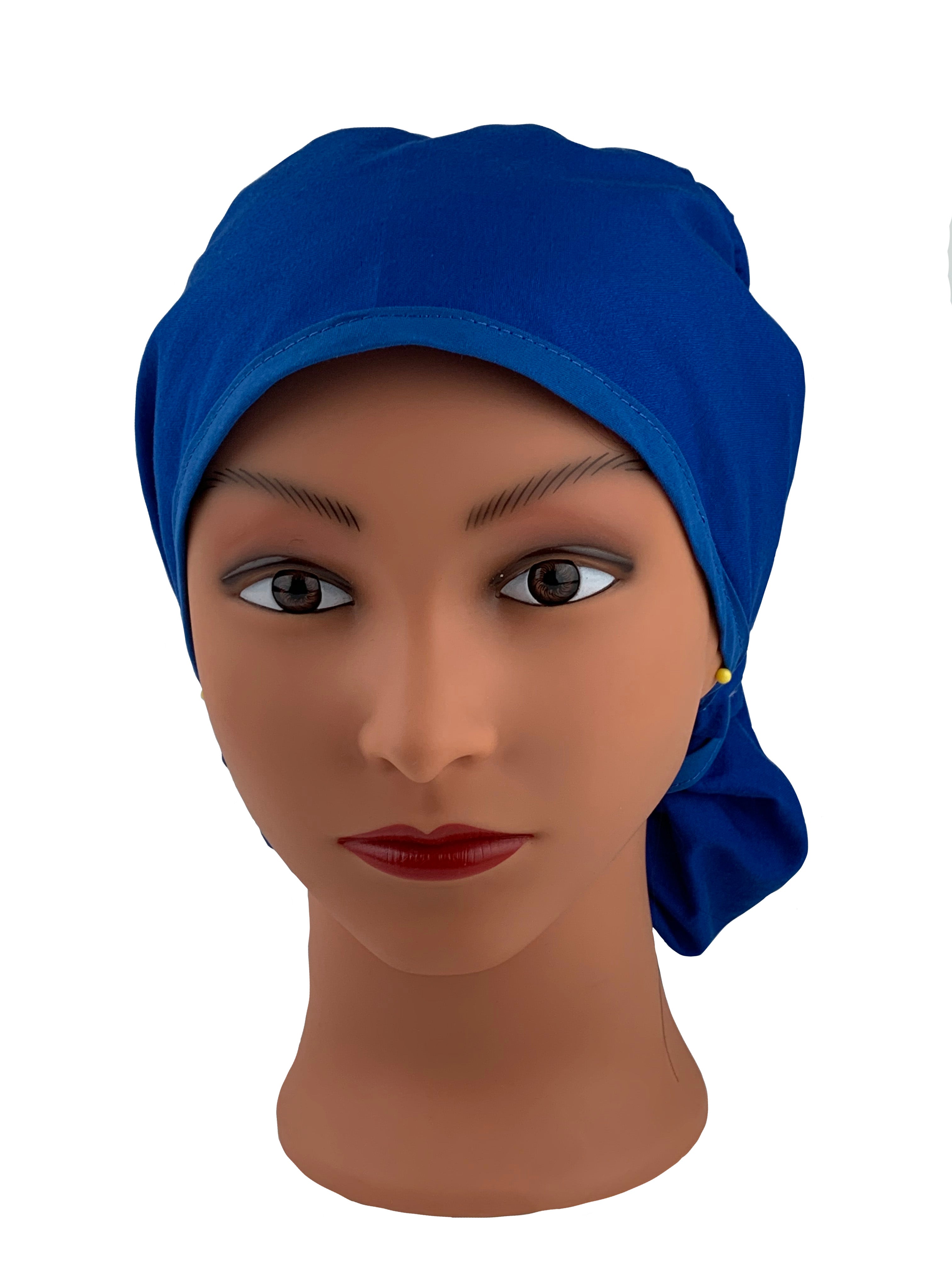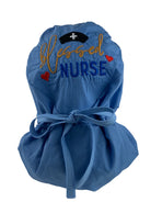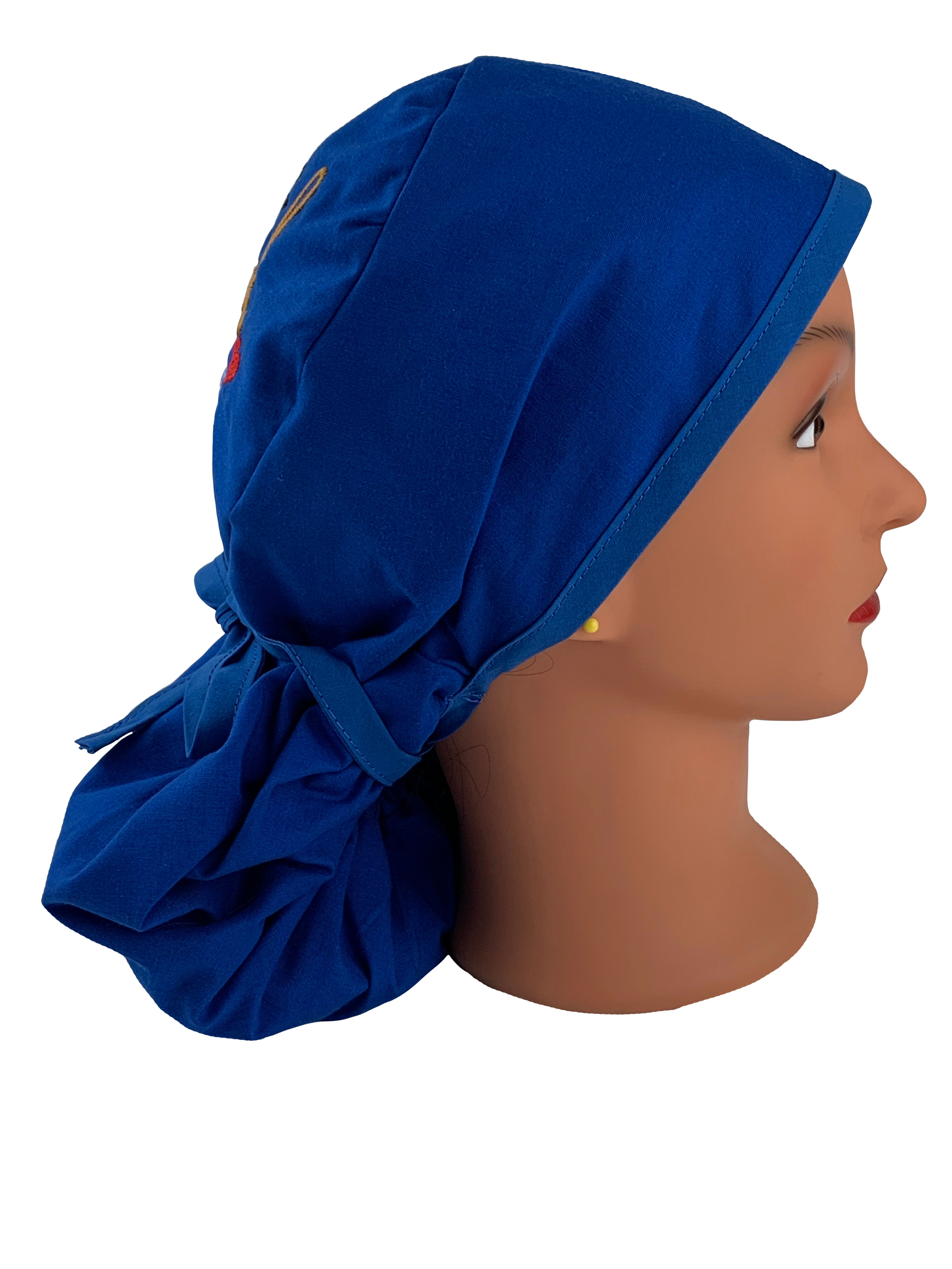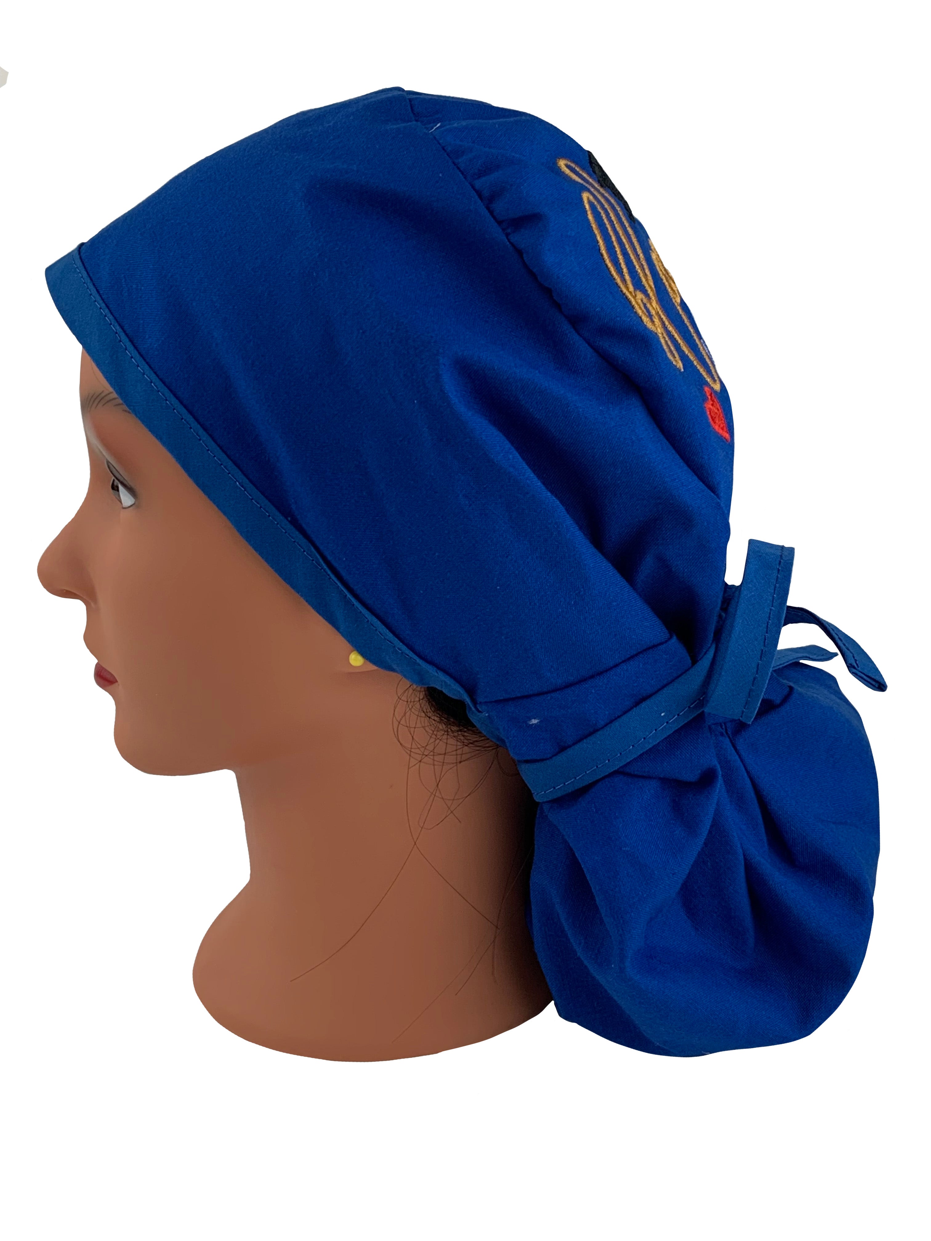 Proclaim your faith with this Christian ponytail scrub cap. This embroidered scrub cap is imprinted with the words 'Blessed Nurse’ on the crown of the cap. This scrub cap is designed for medical professionals with longer hair. The scrub cap has elastic in the back of the cap and extra-long tie straps to make for a more secure fit. The scrub cap is made of 100% cotton and is machine washable. It is recommended that you do not use bleach. These scrub caps are currently available in five colors/design prints: burgundy, gray, green, light blue, and royal blue.