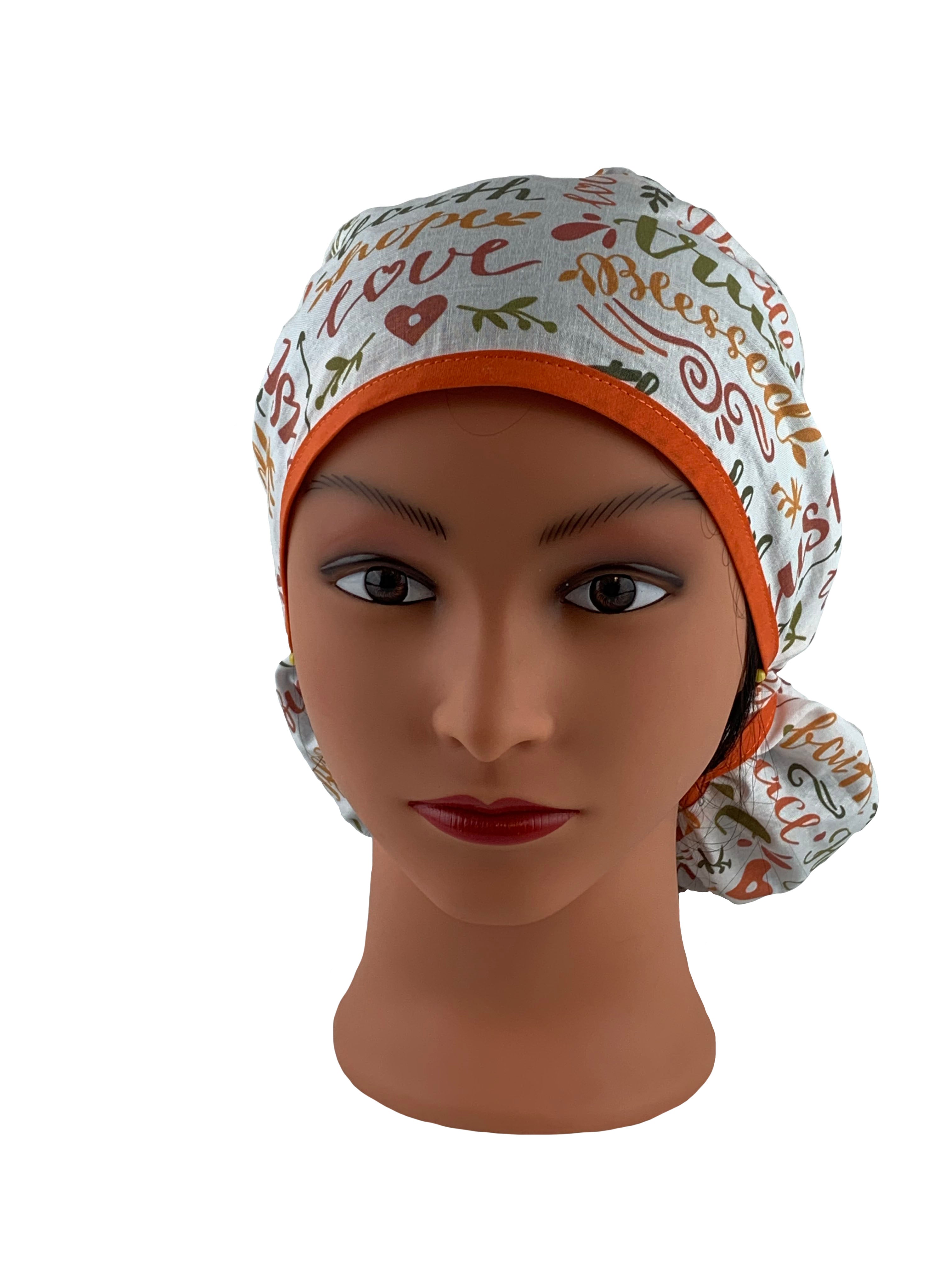 Proclaim your faith with this Christian ponytail scrub cap. This scrub cap is imprinted with various words of affirmation and inspiration. This scrub cap is designed for medical professionals with longer hair. The scrub cap has elastic in the back of the cap and extra-long tie straps to make for a more secure fit. The scrub cap is made of 100% cotton and is machine washable. It is recommended that you do not use bleach.
