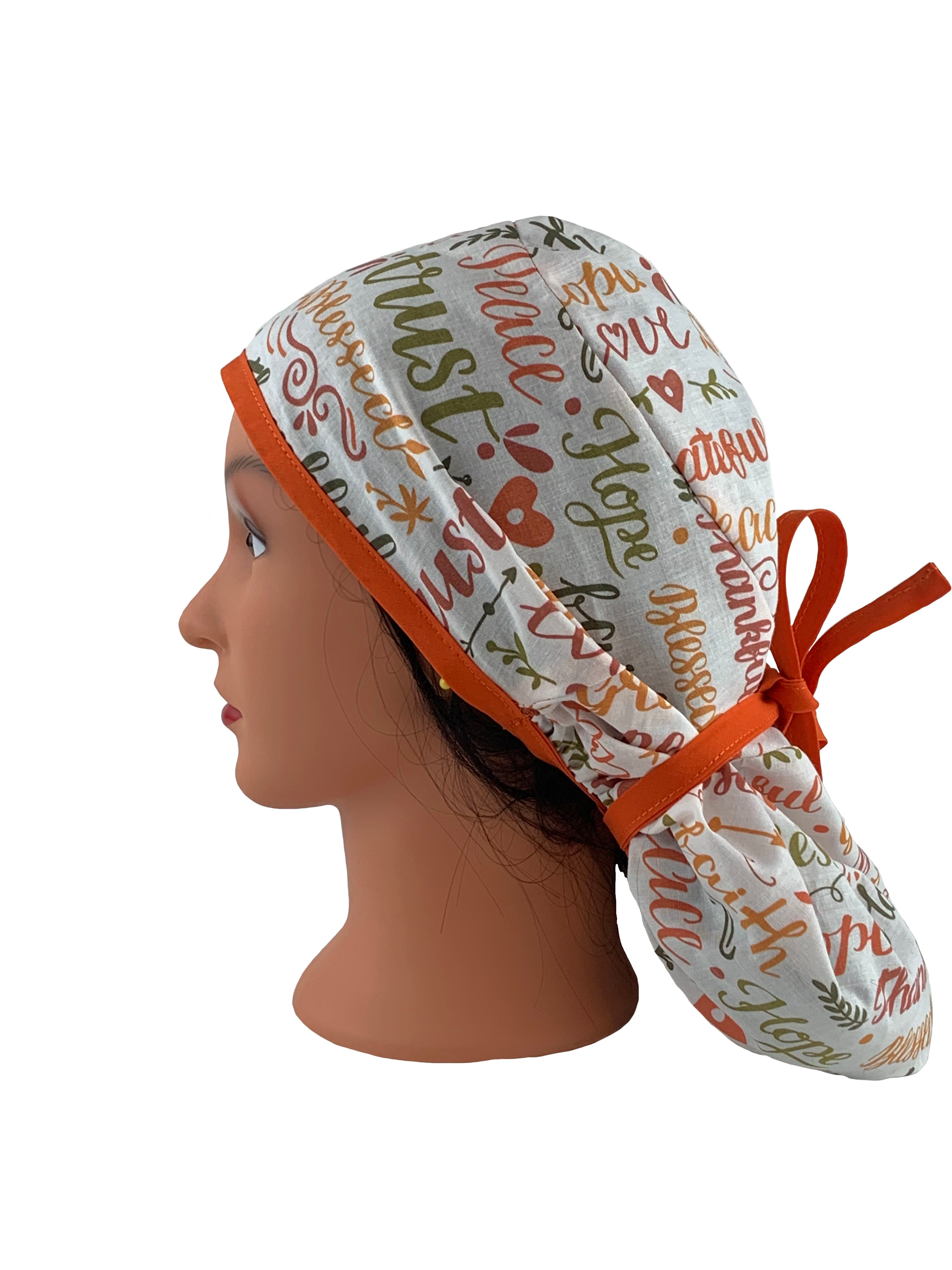 Inspirational Words Ponytail Scrub Caps—Thankful and Blessed