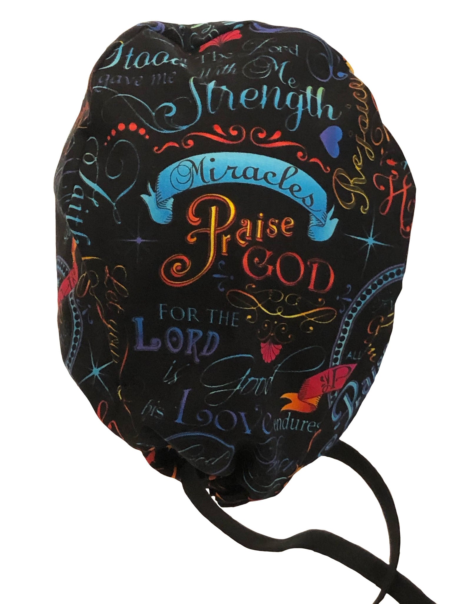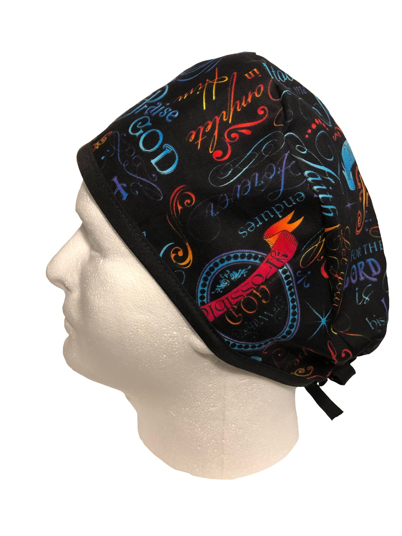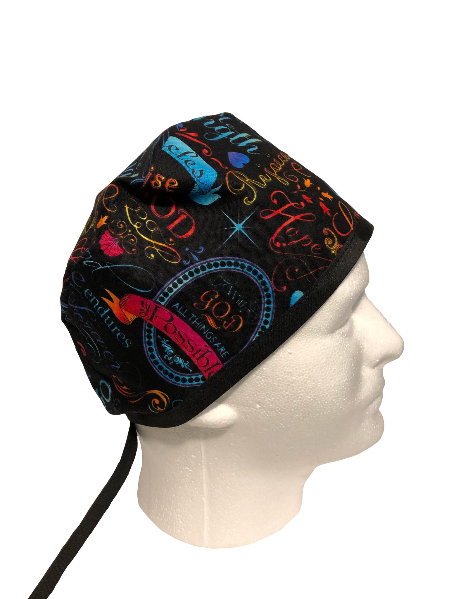 Proclaim your faith with this Christian scrub cap. This scrub cap is imprinted with various words of affirmation and inspiration. The cap has an elastic in the back of the cap and a tie at the end for a more secure fit. The scrub cap is made of 100% cotton and is machine washable. It is recommended that you do not use bleach. These scrub caps are currently available in three design prints with more designs on the way.
