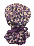 Ponytail surgical scrub cap with a purple floral, springtime print. Perfect for those with longer hair. One size fits most. Has a tie at the end for a more secure fit.