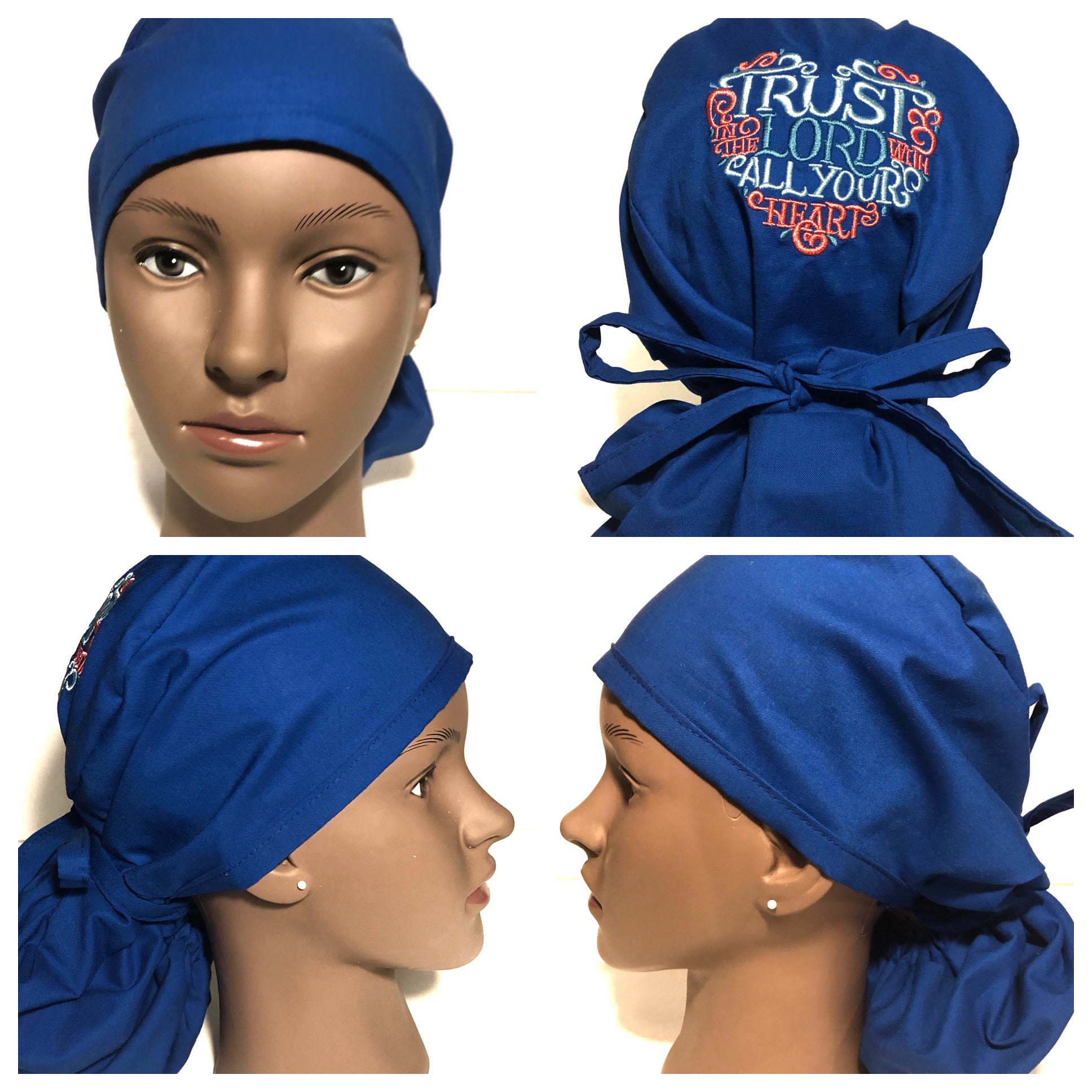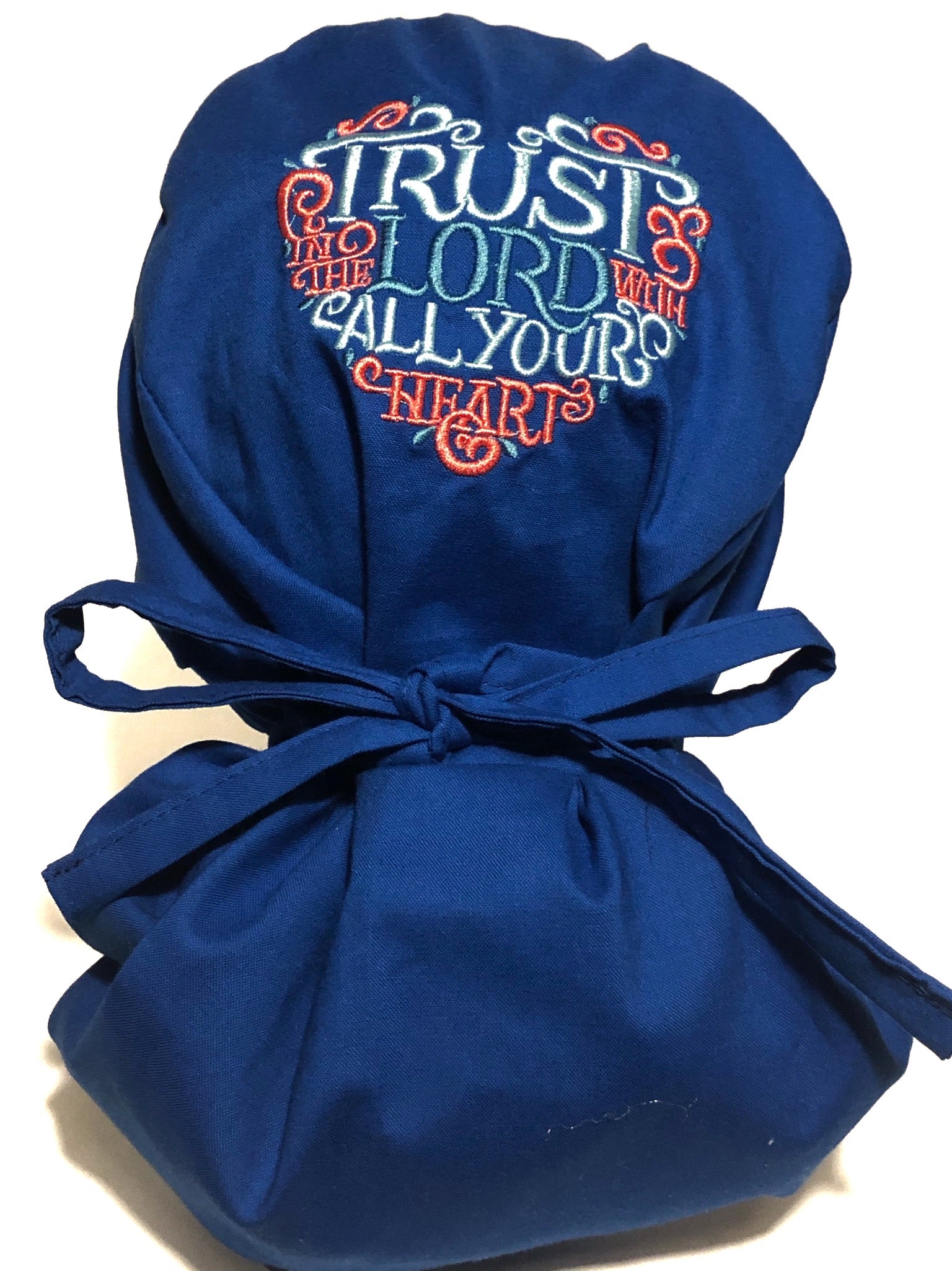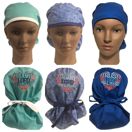 Proclaim your faith with this embroidered Christian ponytail scrub cap. This scrub cap is imprinted with the words "Trust in the Lord with All Your Heart" on the crown of the cap. This scrub cap is designed for medical professionals with longer hair. The scrub cap has elastic in the back of the cap and extra-long tie straps to make for a more secure fit. The scrub cap is made of 100% cotton and is machine washable. It is recommended that you do not use bleach. These scrub caps are currently available in three colors: blue, green, deep blue with more color options on the way.
