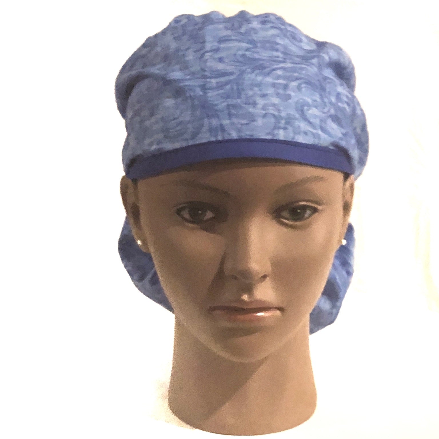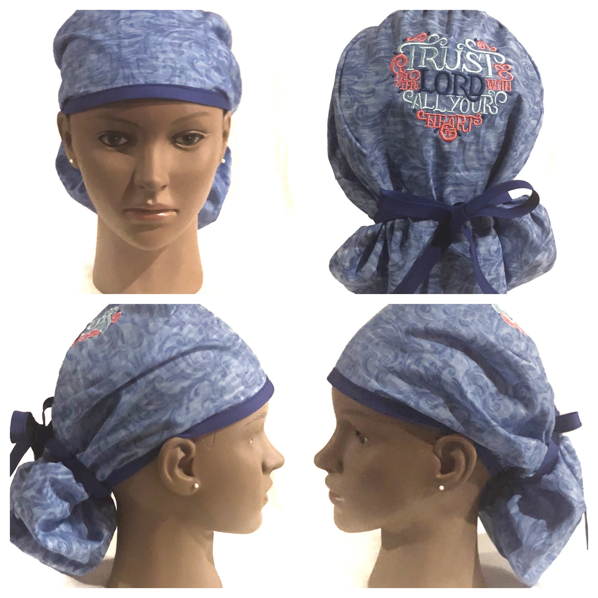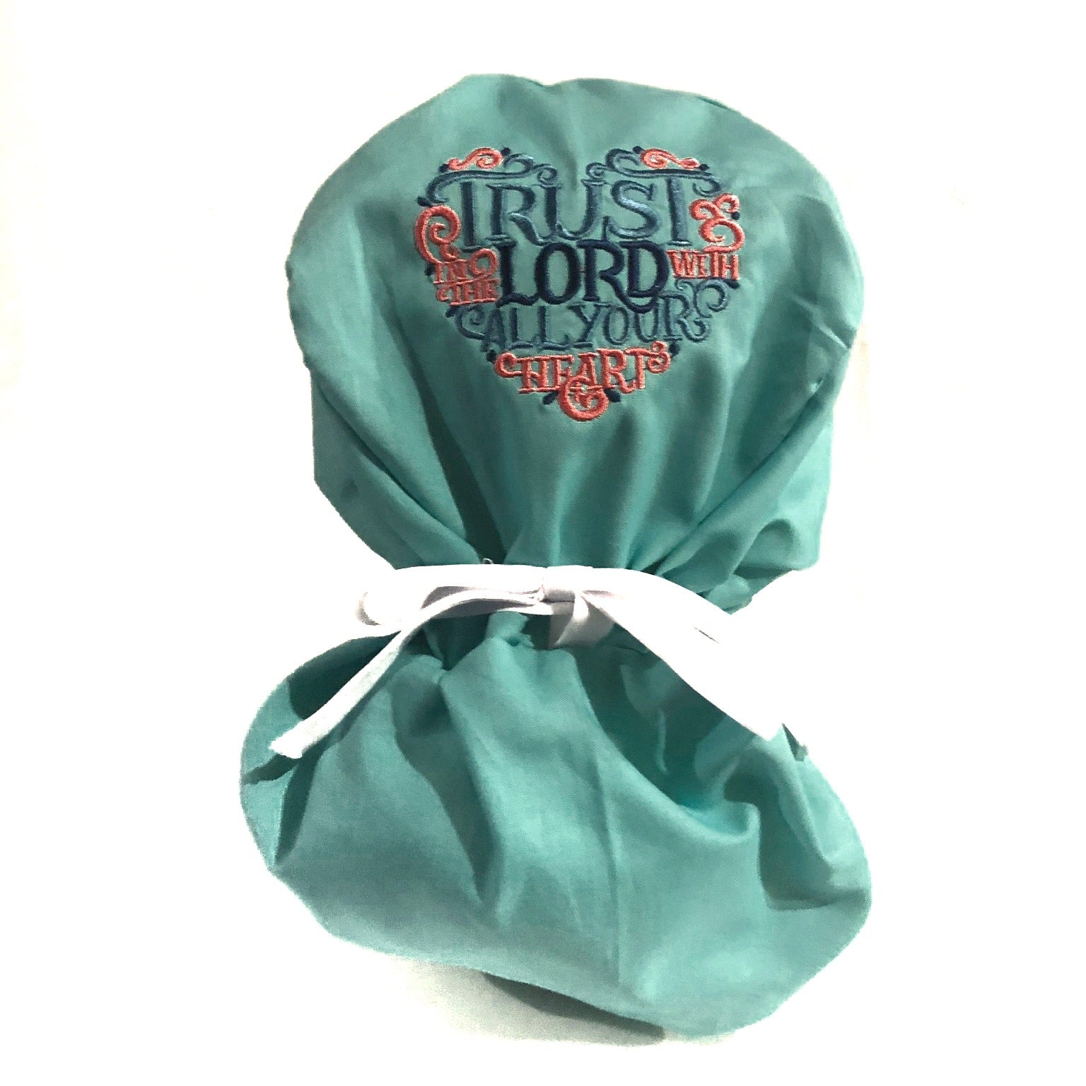 Proclaim your faith with this embroidered Christian ponytail scrub cap. This scrub cap is imprinted with the words "Trust in the Lord with All Your Heart" on the crown of the cap. This scrub cap is designed for medical professionals with longer hair. The scrub cap has elastic in the back of the cap and extra-long tie straps to make for a more secure fit. The scrub cap is made of 100% cotton and is machine washable. It is recommended that you do not use bleach. These scrub caps are currently available in three colors: blue, green, deep blue with more color options on the way.